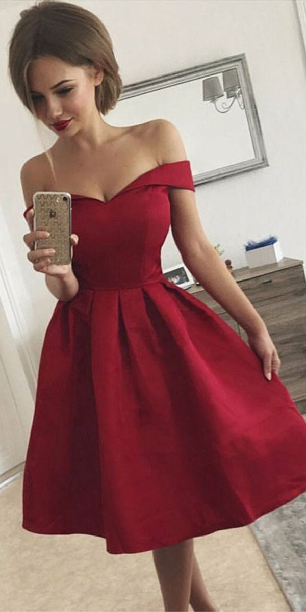 WD0069,A-Line Off-the-Shoulder Pleated Red Satin Homecoming Dress