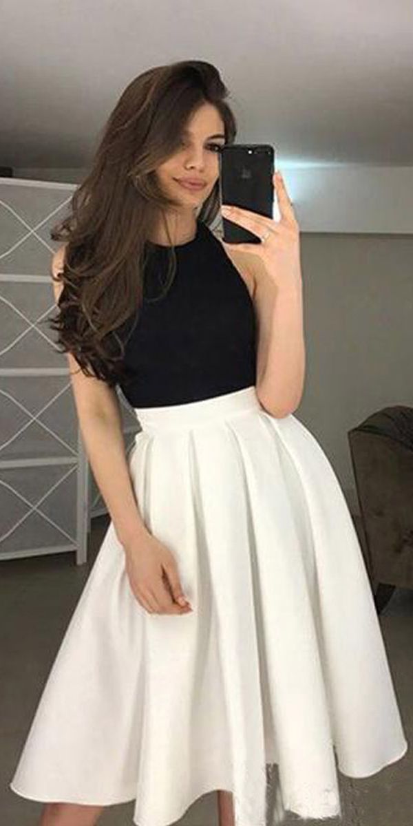 WD0071,Halter A-Line Backless Satin Homecoming Dress,Black Ivory Homecoming Evening Dress,Tea Length Formal Gown