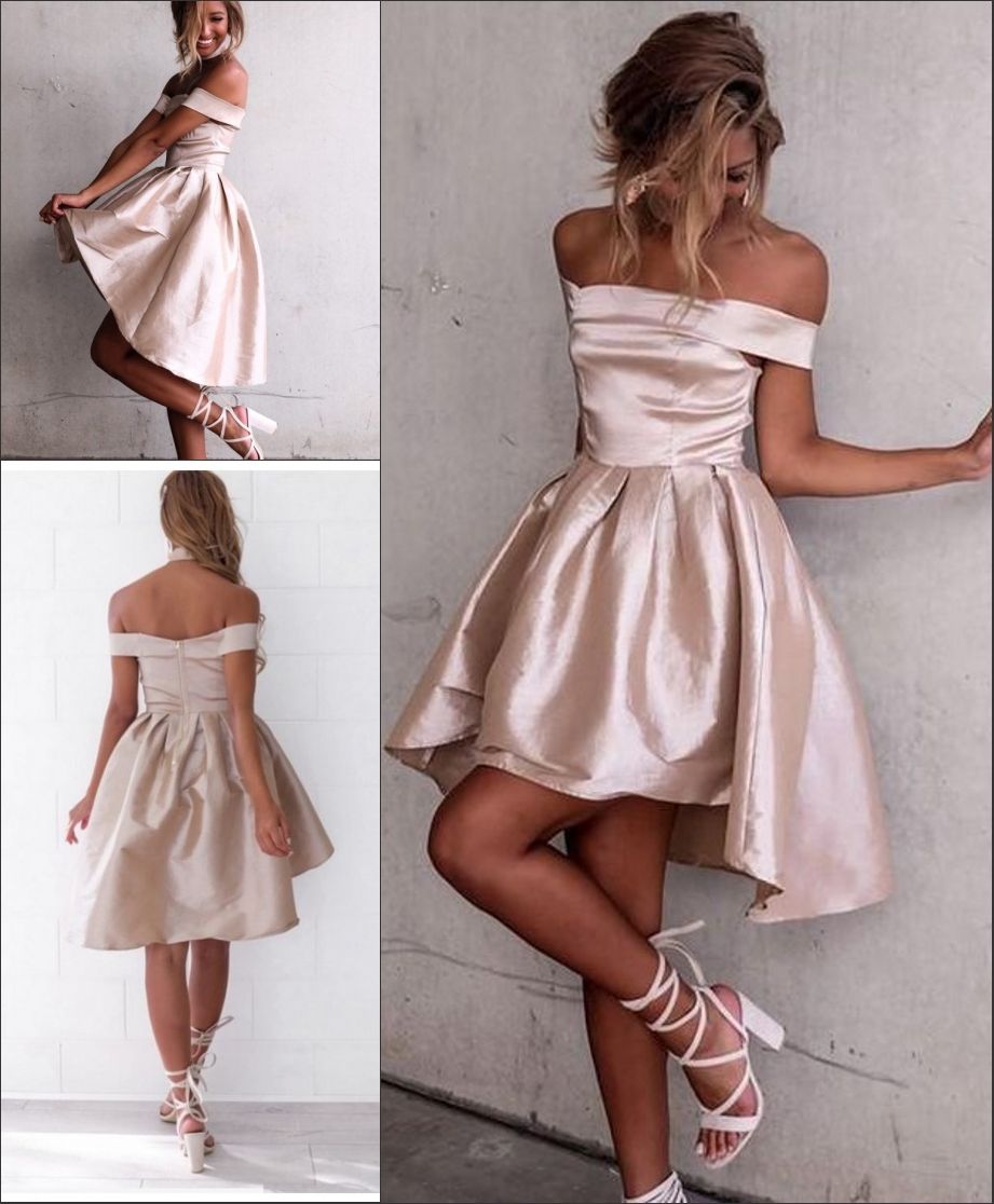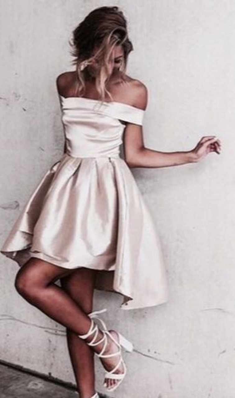 WD0128,Glossy A-line Light Pink Homecoming Dresses,Off-the-Shoulder Hi-Lo Graduation Dresses