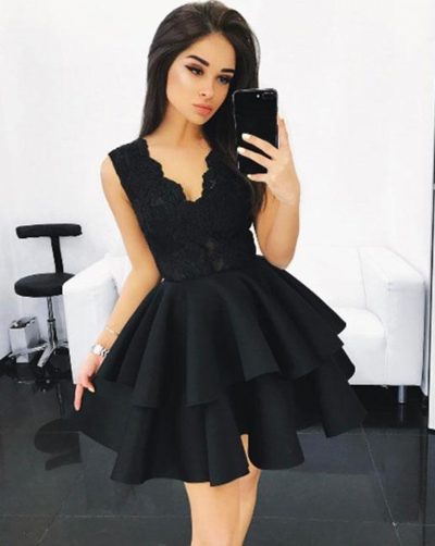 WD0308,Cute black lace short homecoming dress ,v neck short prom dress