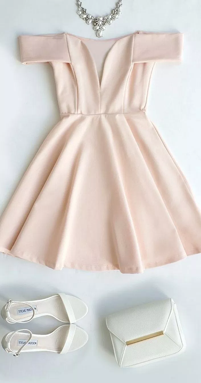 WD0644,Cute Off-the-Shoulder Homecoming Dress, Light Pink Prom Dress,V-Neck Evening Dress,Party Dress