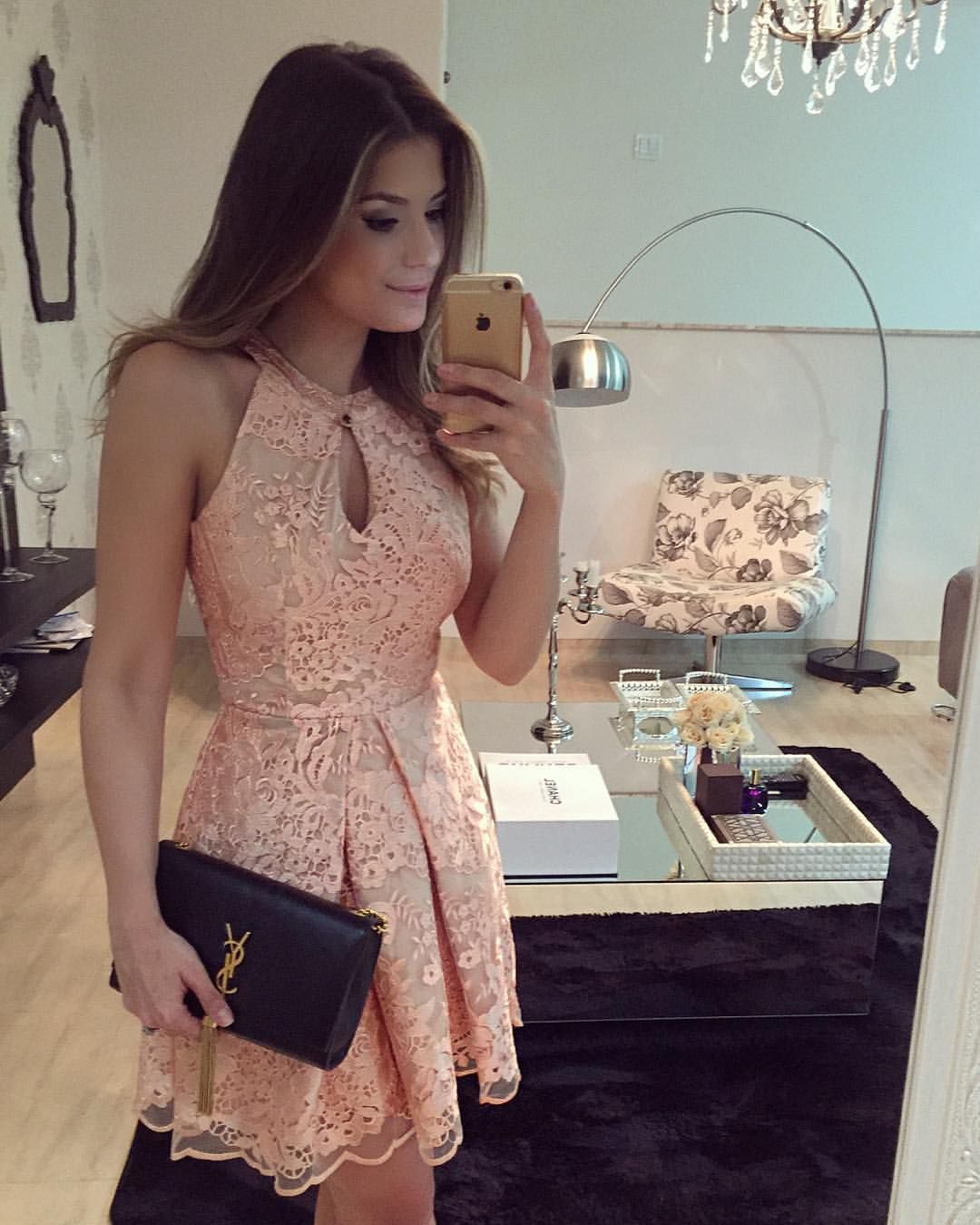 WD0646,Blush Pink Lace Homecoming Dresses,Halter Mini Prom Dress