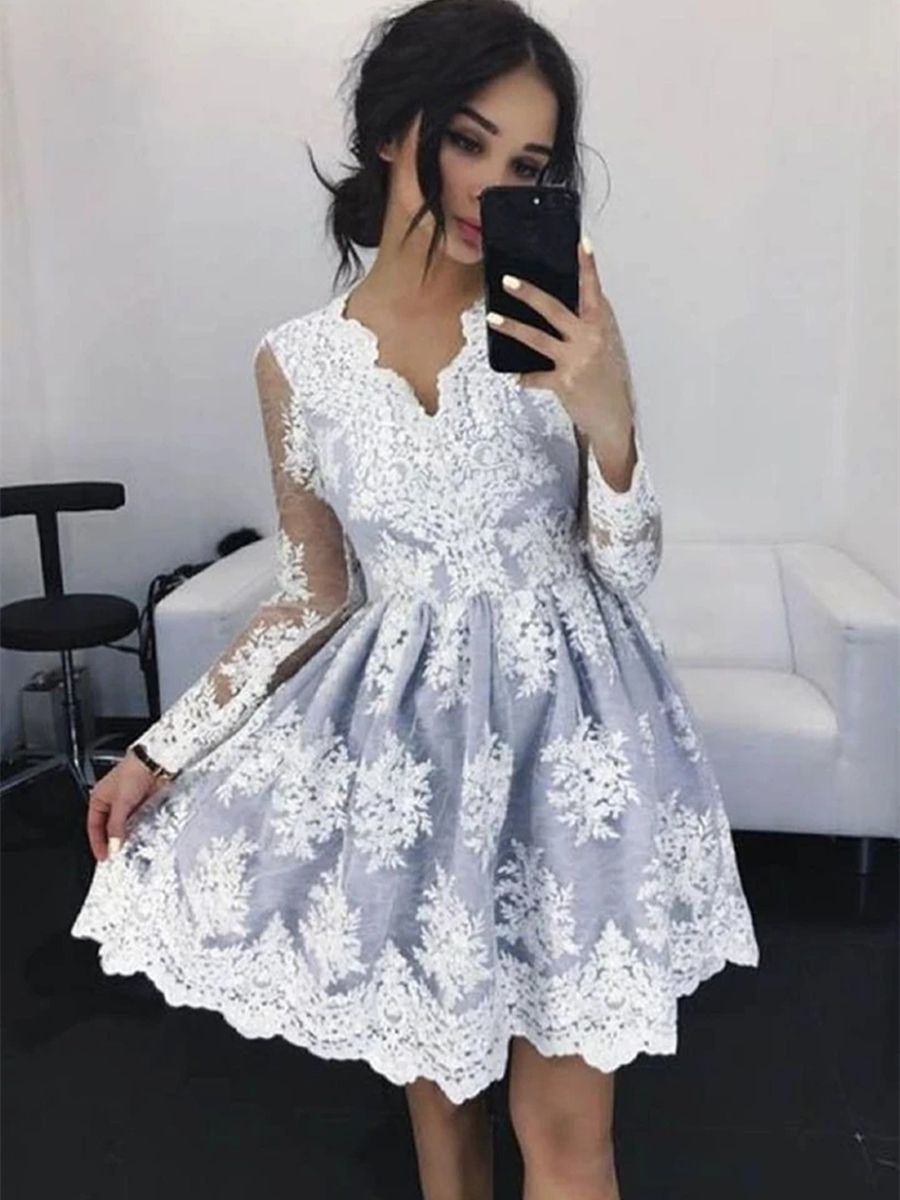 WD0649,Lace Homecoming Dresses,V neck Long Sleeves Mini Party Dresses