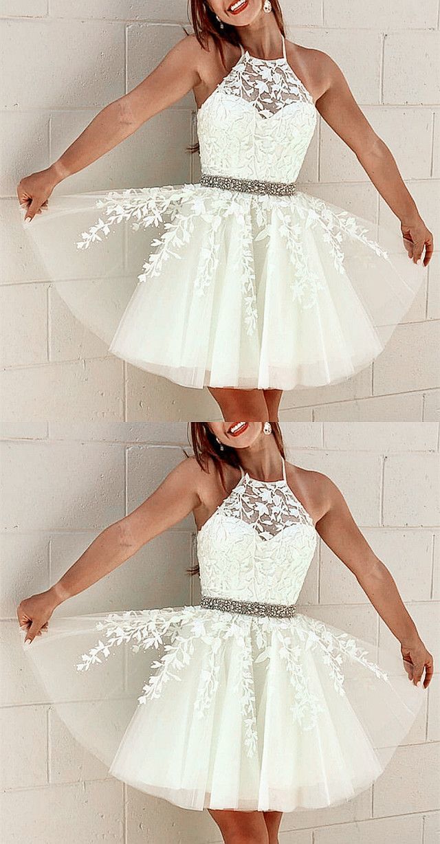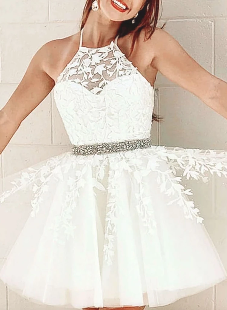 WD0673,Cute White Lace Homecoming Dresses,Beaded Halter Homecoming Dresses with Applique