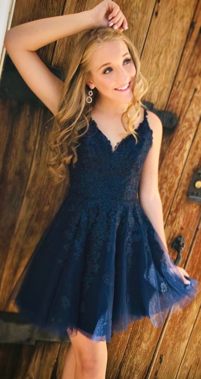 WD0699,Navy Blue Homecoming Dresses,V neck Lace Homecoming Dresses,Hoco Dresses