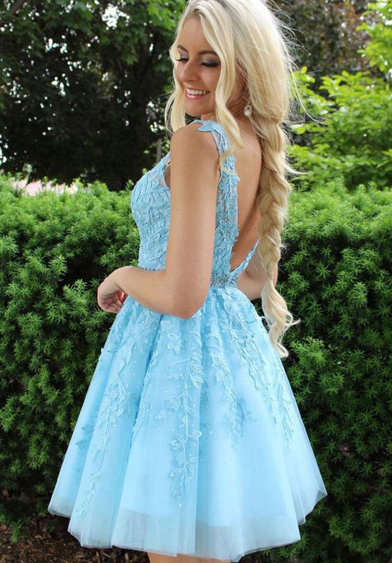 WD0723,Charming A-Line V Neck Open Back Light Blue Lace Short Homecoming Dresses,Red Prom Dresses Short,Back to School Dresses,Junior Dresses