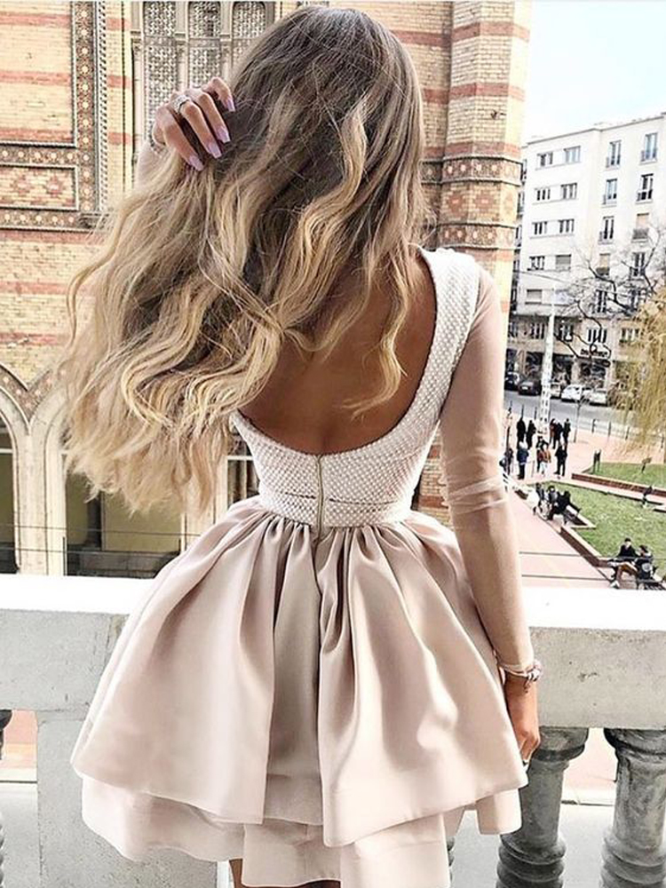 WD0771,Cute A Line High Neck Long Sleeves Champagne Lace Hoco Dresses,2020 Fashion Homecoming Dresses