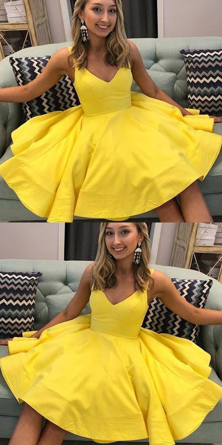 WD1079,Cute A-Line Yellow Satin V-Neck Homecoming Dresses Short Semi Formal Gown Dress Mini Party Dress