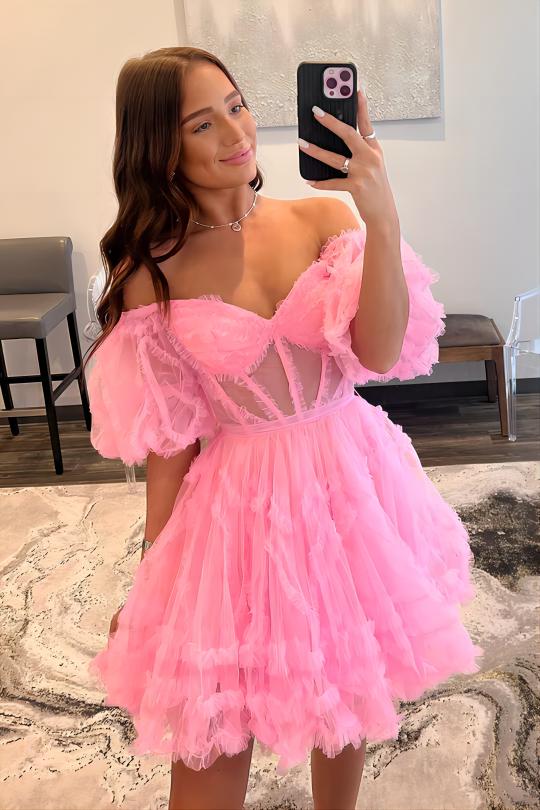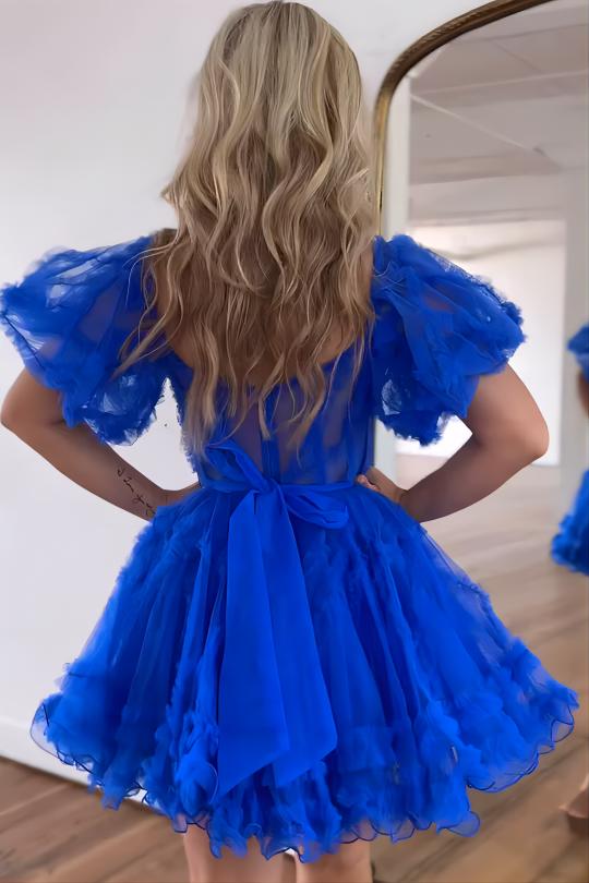WD1151,Cute Blue A-Line Off The Shoulder Ruffle Homecoming Dress