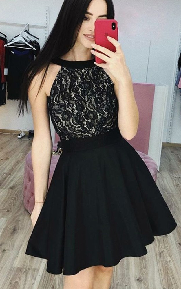 WD1159,Black halter lace homecoming dresses A-Line back to school dress
