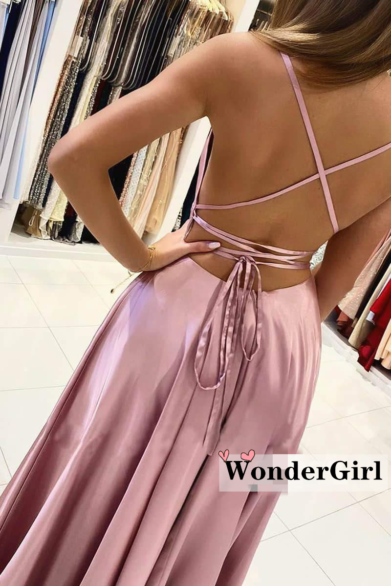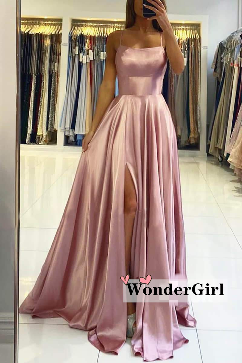 WD0018,A-line Scoop Stretch Satin High Split Long Simple Prom Dress Formal Evening Gowns