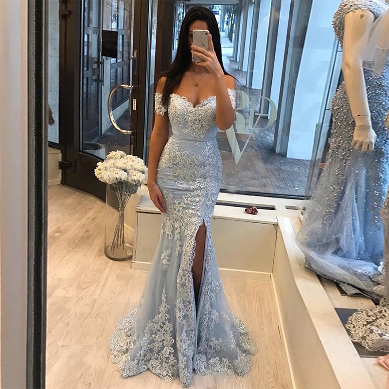 WD0019,Light Blue Mermaid Tulle Appliques Off the Shoulder Prom Dress 2020