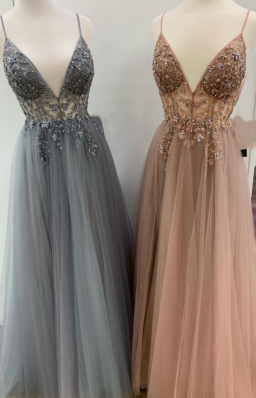 WD0021,Grey Tulle Sparkly A-line V-neck Beaded Spaghetti Straps Long Prom Dresses