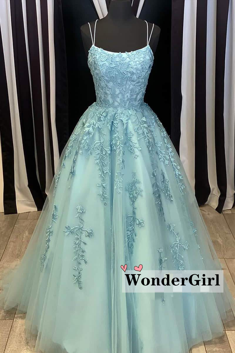 WD0032,Beautiful A Line Spaghetti Straps Blue Long Prom/Evening Dresses with Appliques