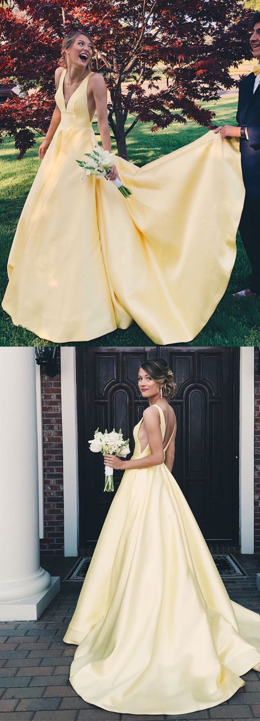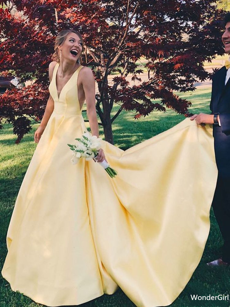 WD0150,Simple Yellow A line Prom Dresses,V neck Long Evening Dress
