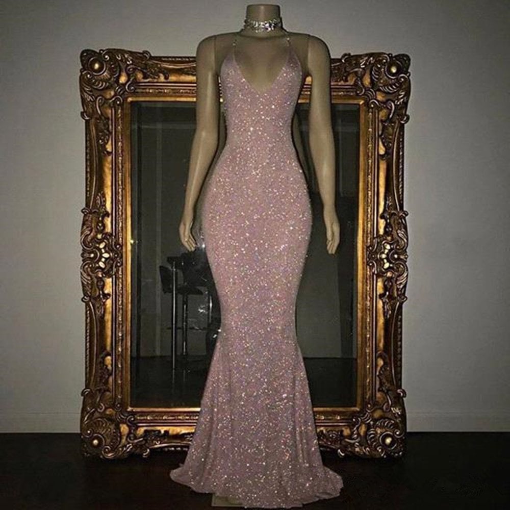 WD0152,Shiny Blushing Pink Prom Dresses Sequins V-Neck Sleeveless Mermaid Evening Gowns