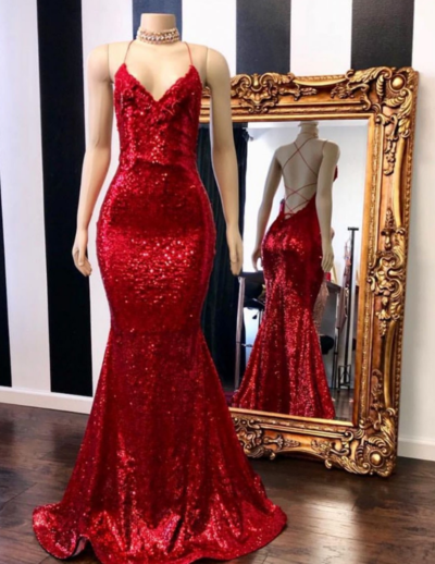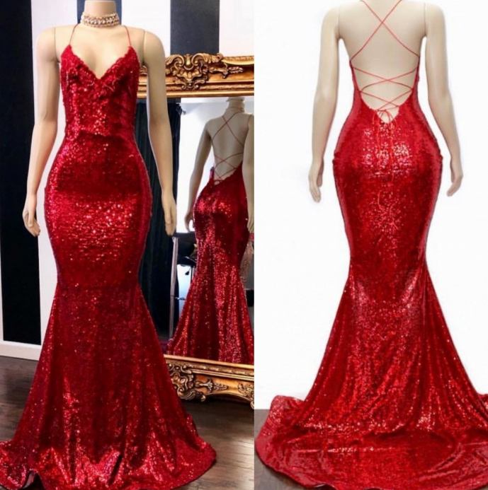 WD0252,Spaghetti Straps Mermaid Sexy Red Sequin Prom Dresses