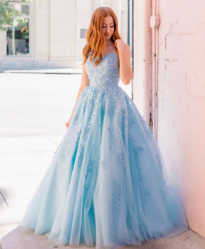 WD0281,Amazing Spaghetti Straps A Line Blue Prom/Evening Dresses with Appliques