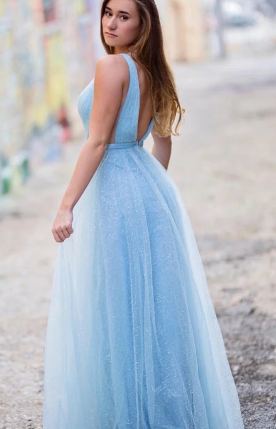 WD0285,Stunning A Line Floor Length Deep V Neck Sleeveless Prom Dress