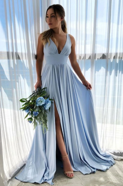 WD0287,Elegant Simple Light Blue V-neck Long Prom Dresses with Front Split