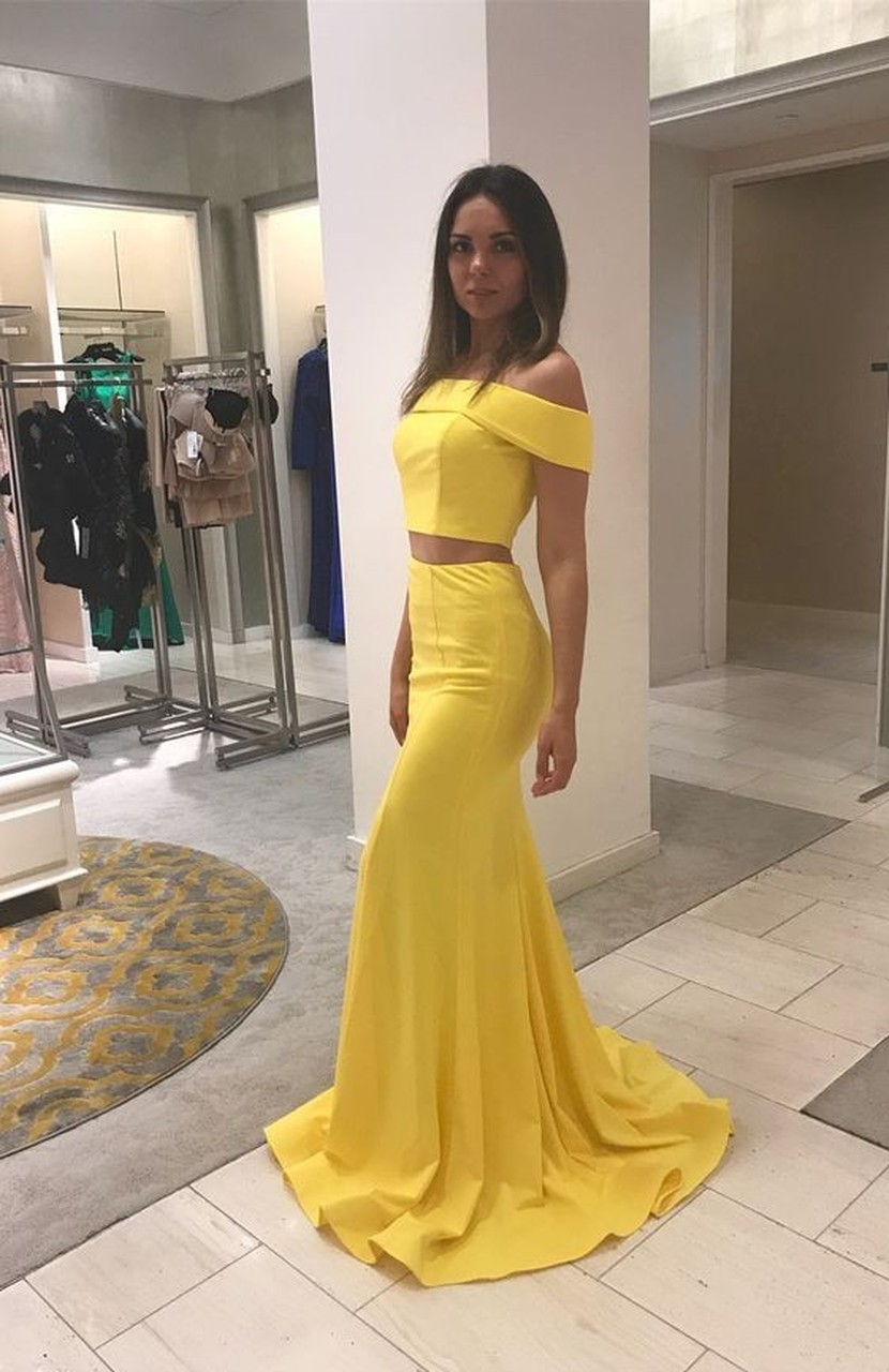 WD0291,Yellow Off The Shoulder Sleeveless Satin Mermaid Two Piece Prom Dress