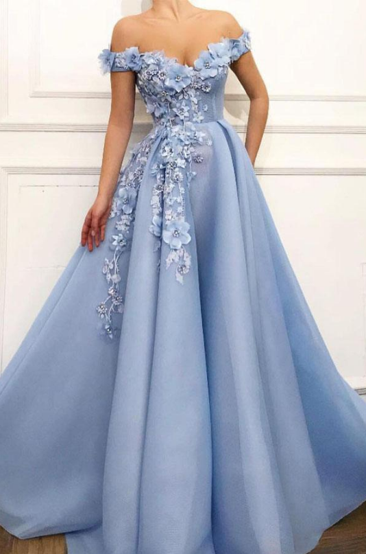 WD0389,Beautiful Off Shoulder A-line Long Blue Prom Dresses with Flower