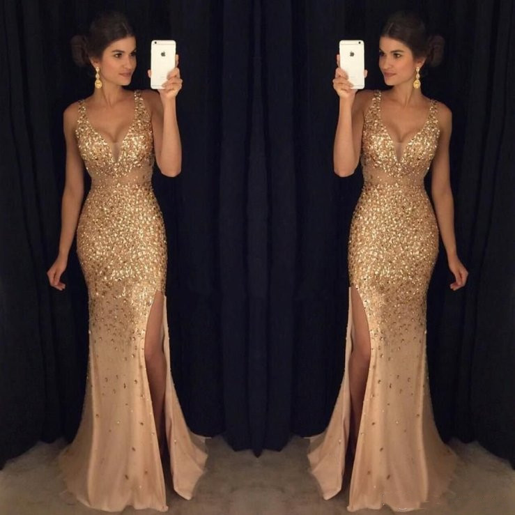 WD0439,Sexy Beading Gold Long Prom Dress, Deep V Neck Evening Dress with beading