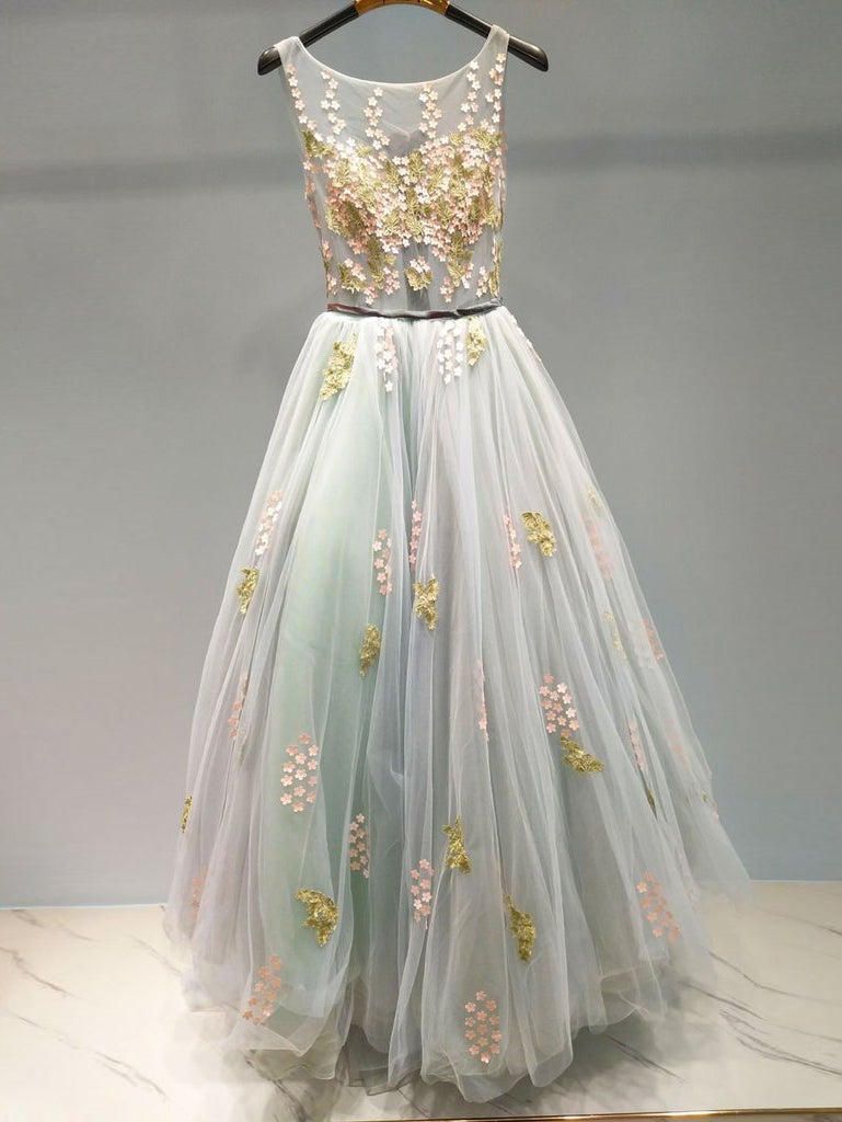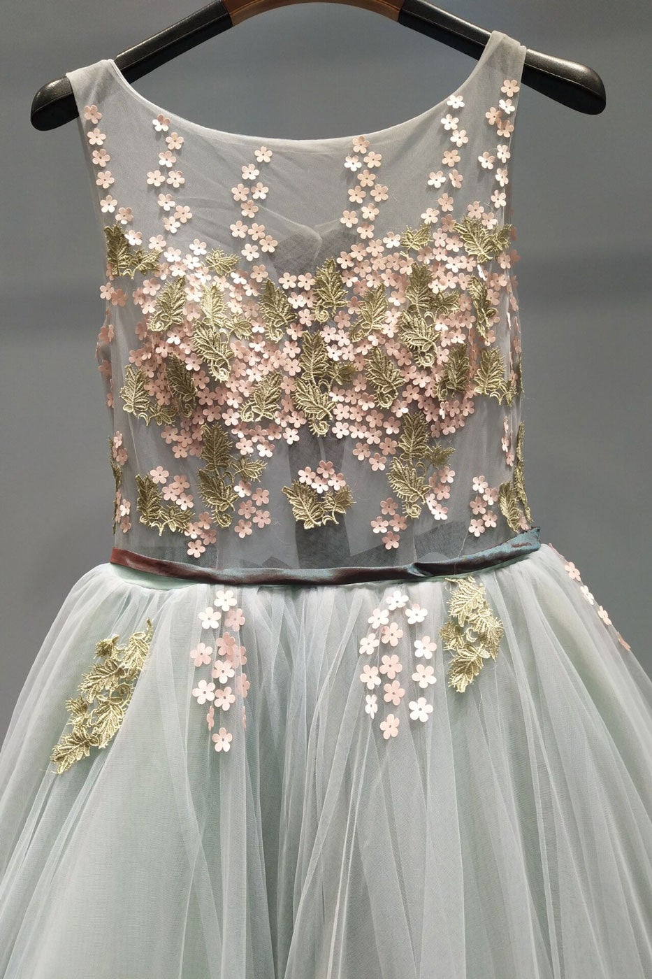 WD0442,Cute tulle floral prom dresses,round neck applique prom evening dress for teen