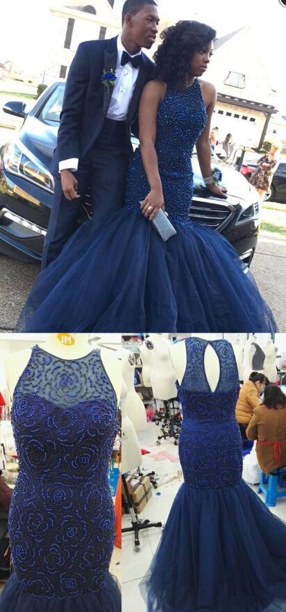 WD0454,Navy Blue Beading Mermaid Prom Dress,Tulle Prom Dress