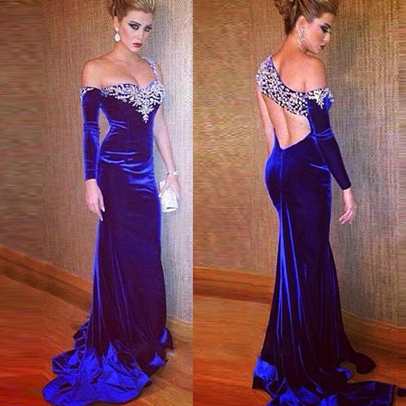 WD0530,One Shoulder Off Shoulder Long Sleeve Mermaid Prom Dress Royal Blue Velvet Appliques Beaded Formal Evening Dresses Long Party Gowns