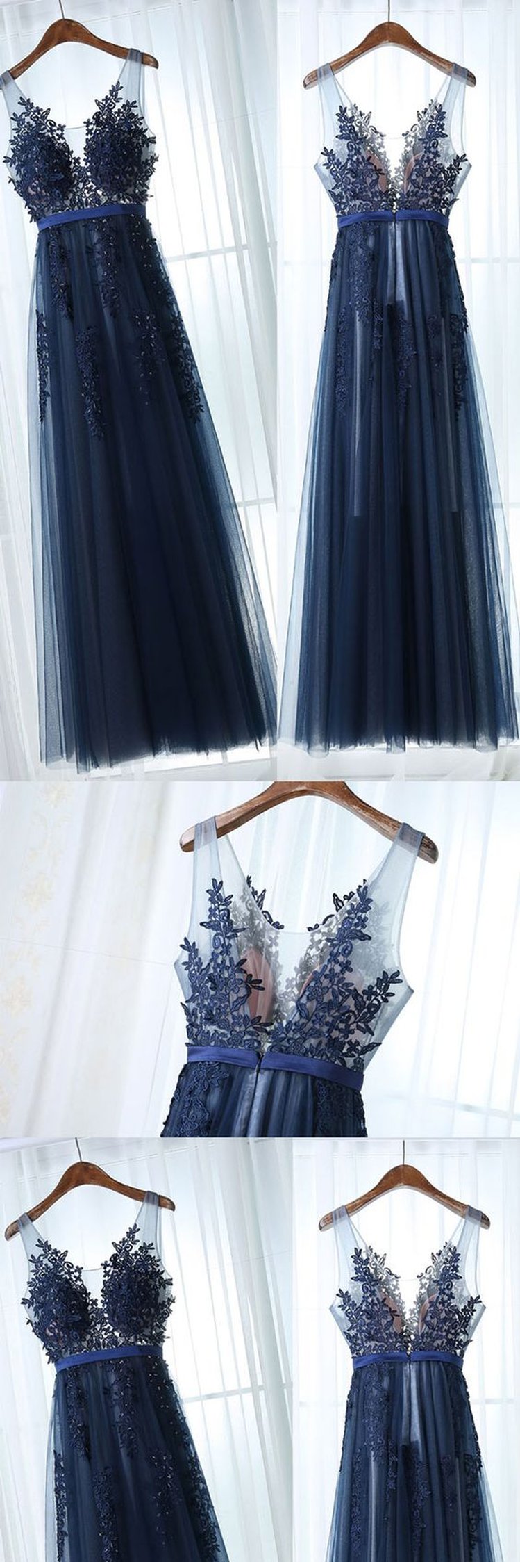 WD0685,Gorgeous Navy Blue Tulle Long Formal Dresses,V-Back Evening Dresses,Long Party Dresses