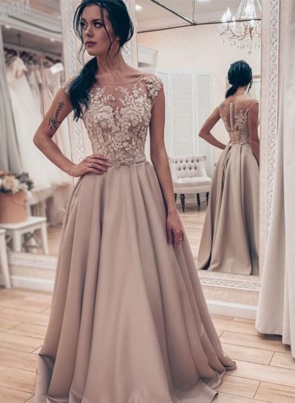 WD0690,Champagne Prom Dresses Round Neck Appliques Evening Party Dresses