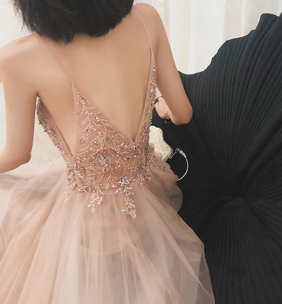 WD0765,Cute V Neck Spaghetti Straps Blush Pink Prom Dresses with Beading,Split Evening Party Dresses