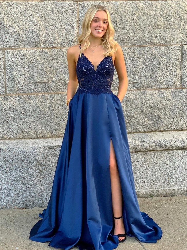 WD0999,Spaghetti straps a-line prom dress applique v-neck satin evening dress