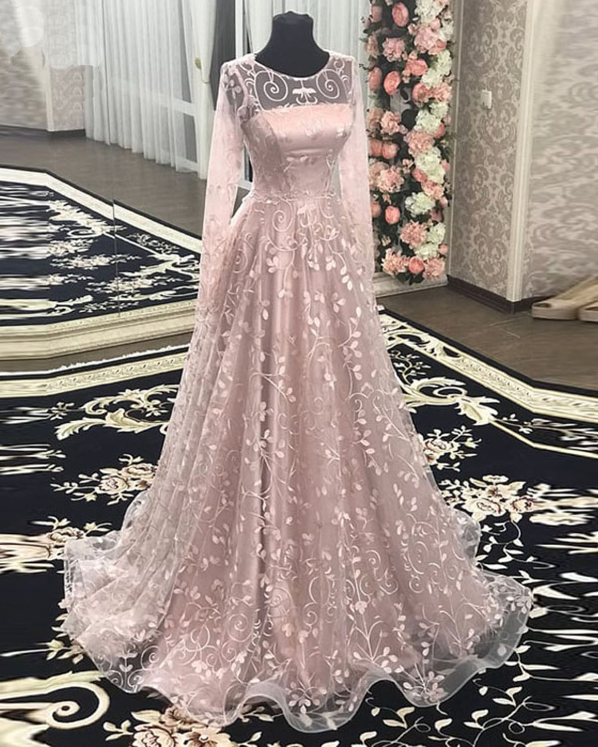 WD1009,Cute pink evening dresses,lace prom dress,long sleeves formal gown