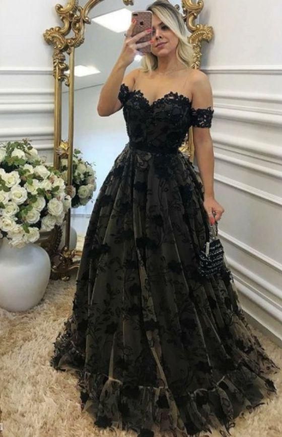 WD1033,Off the shoulder black lace prom ball gown long evening prom dresses