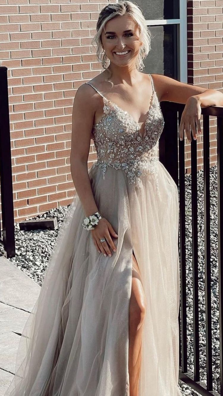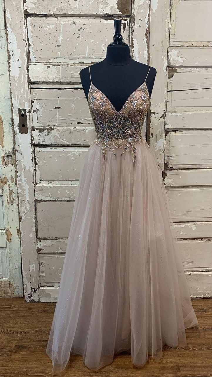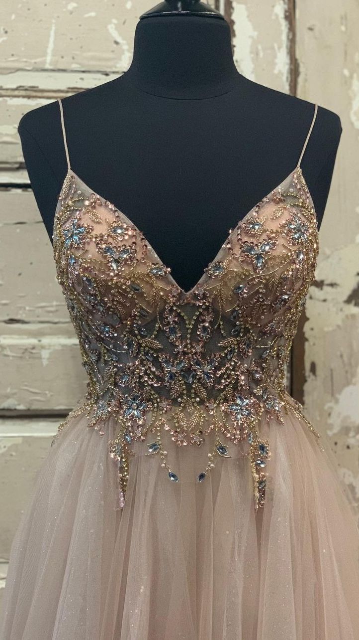 WD1051,Charming beaded prom dress,champagne tulle prom dresses,v-neck long evening dress,spaghetti straps evening gown