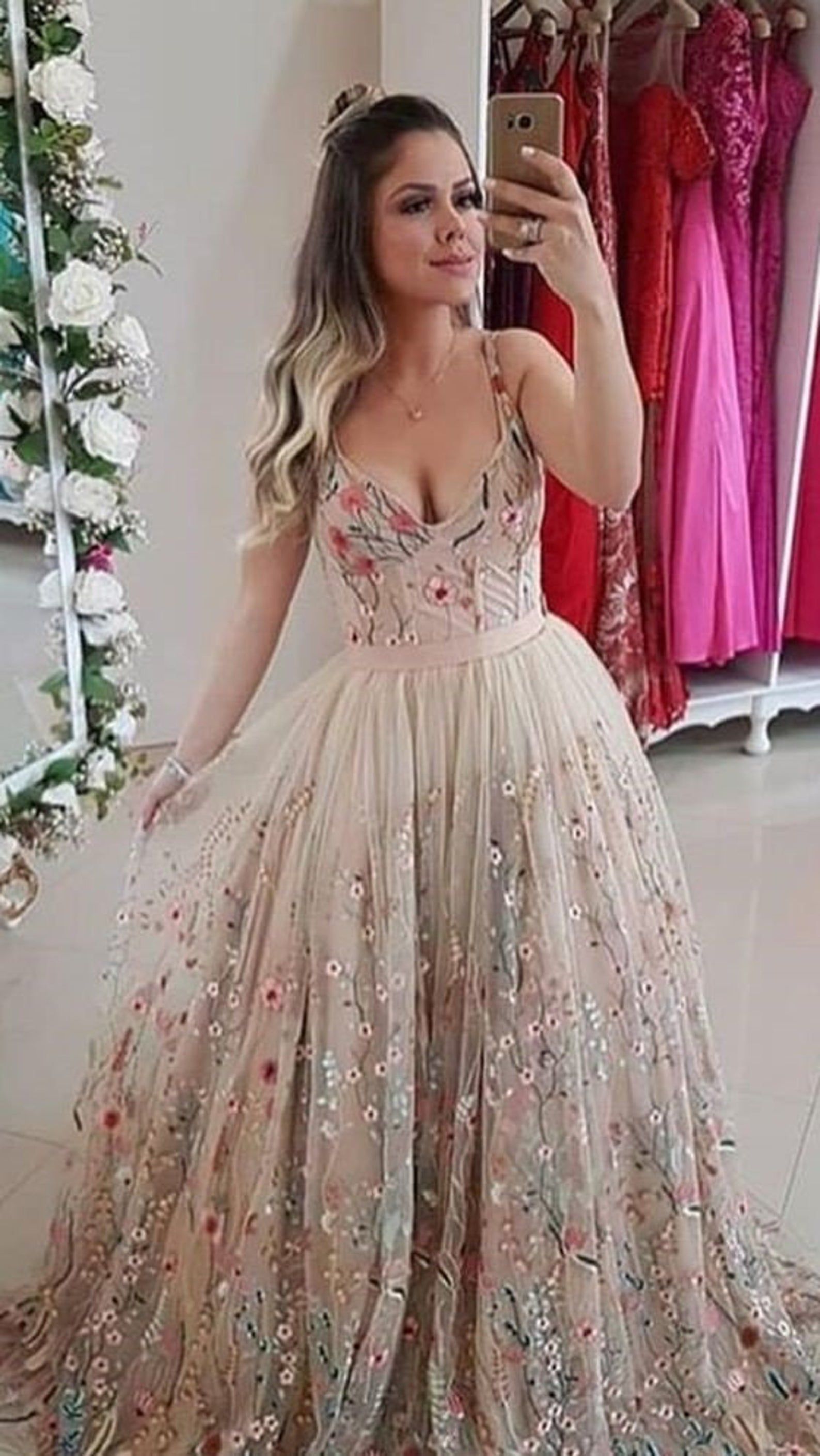 WD1080,Charming Spaghetti Straps Flower Appliques V Neck Prom Dress,Lace Ball Gown