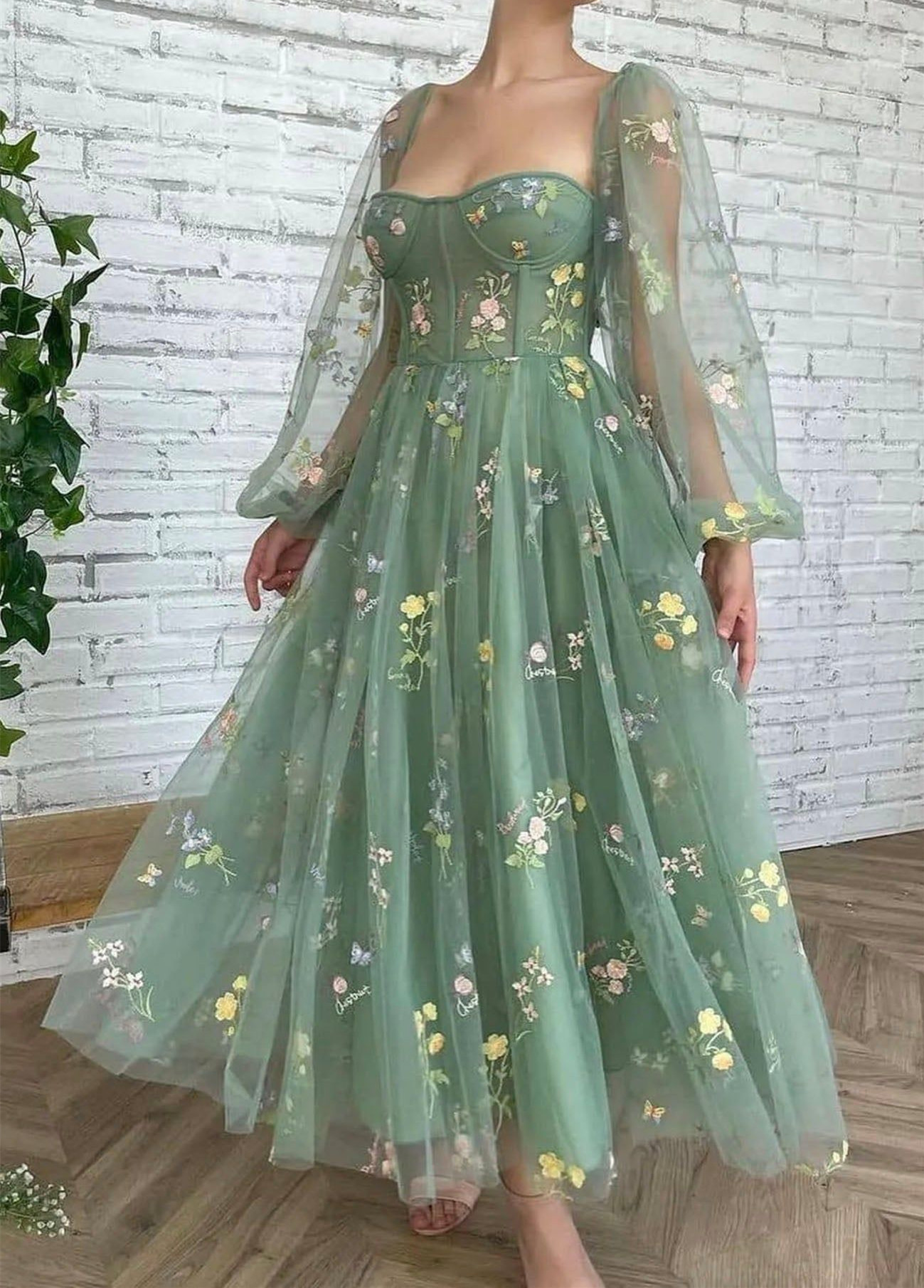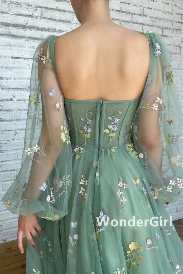 WD1088,Good quality bubble sleeves a-line tulle embroidery prom evening dresses
