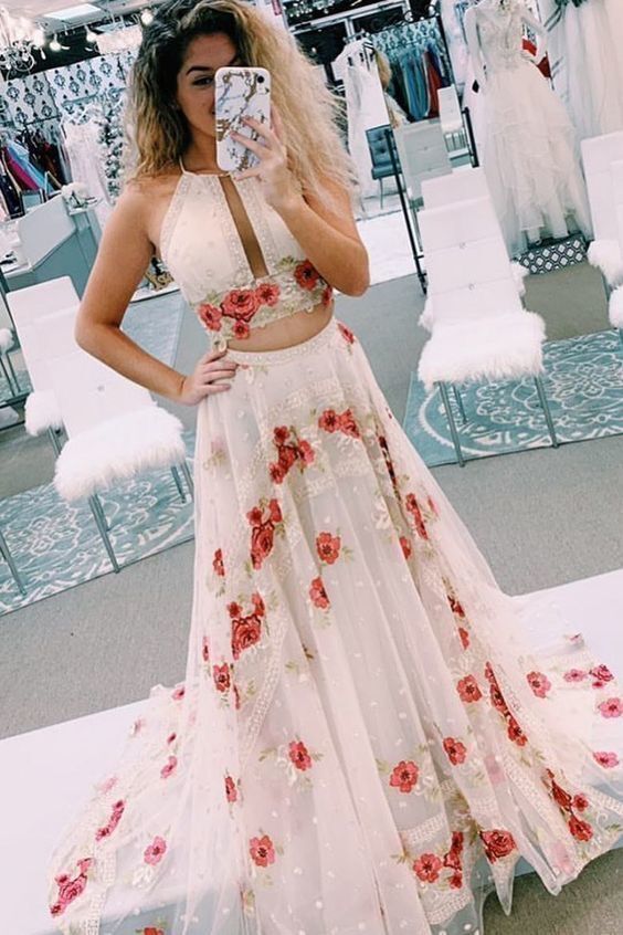 WD1105,Rose floral prom dresses two pieces long evening dress
