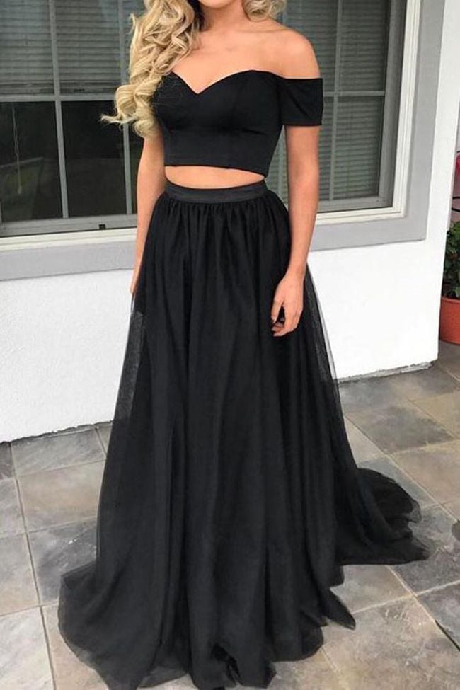 WD1111,Two pieces black a-line tulle prom dress long evening dresses