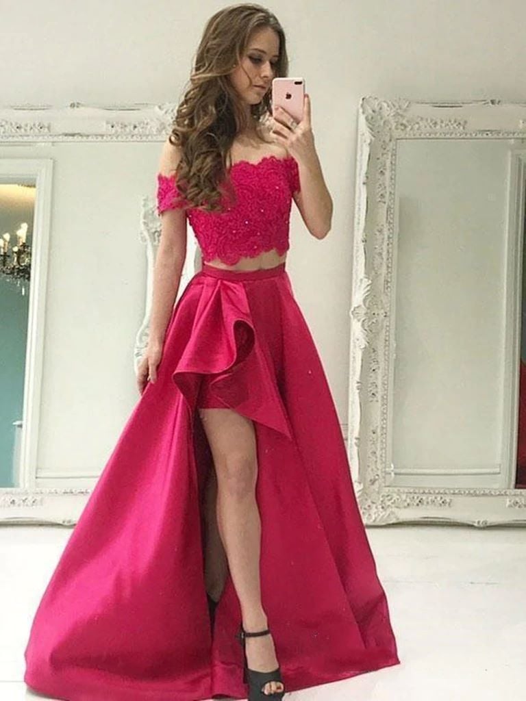 WD1115,Two pieces prom dress off the shoulder satin long evening party dresses