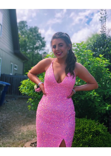 WD1212,Cute Pink Sequin Prom Dresses, Slit Long Evening Gown