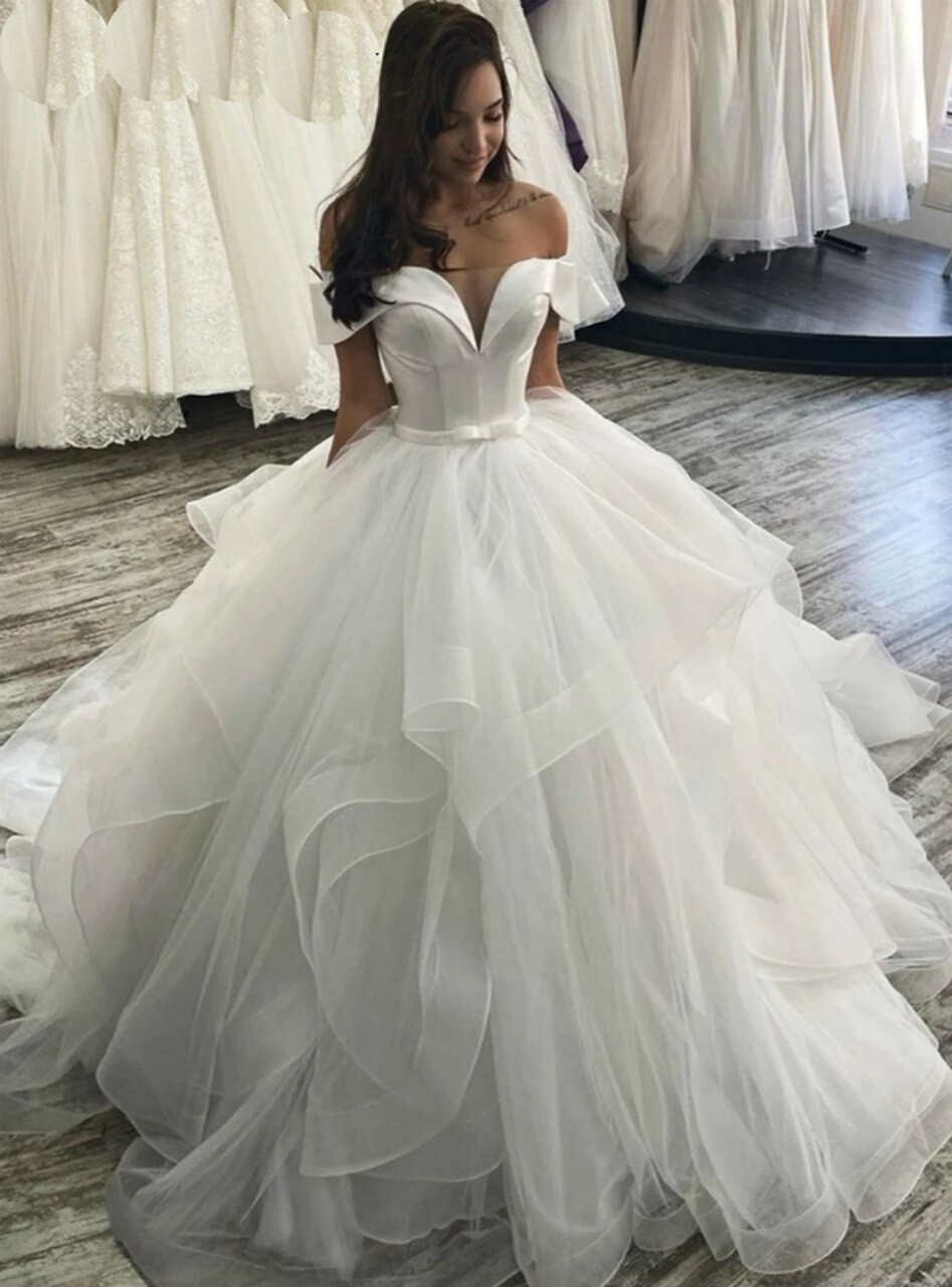 WD0580,White Off Shoulder Ball Gown Wedding Dress Sweetheart Tulle Ruffles Tiered Custom Women Bridal Gowns