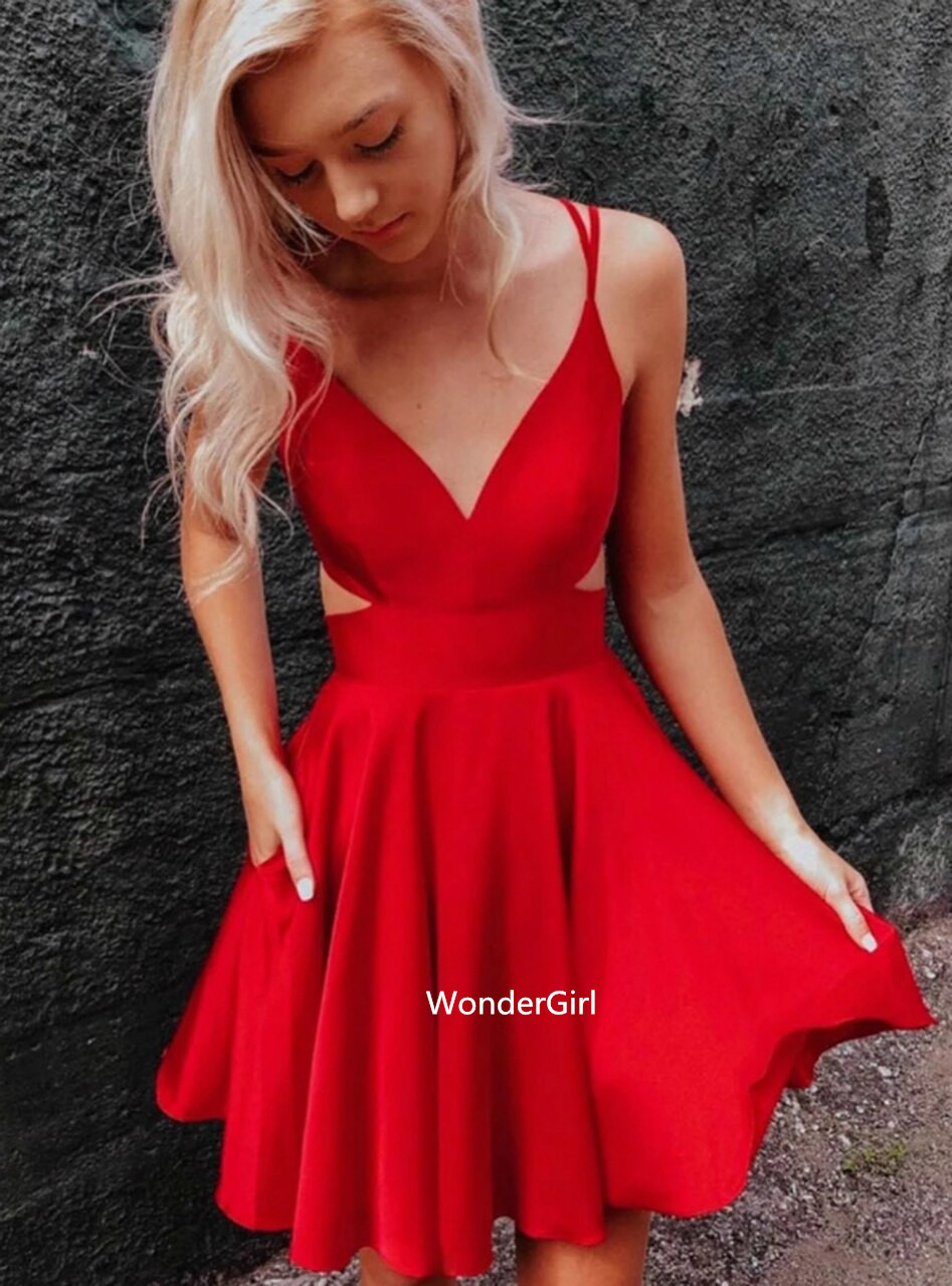 WD0059,Cute Short V Neck Red Double Straps A Line Hoco Party Dress with Cut Outs,Short Prom Dress