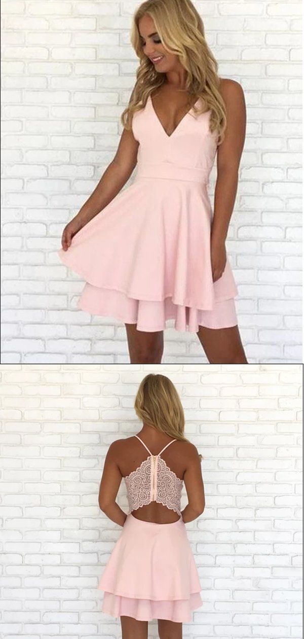 WD0013,Pretty Spaghetti Strap V Neck Zipper A Line Short Homecoming Dress,Lace Pink Homecoming Dresses