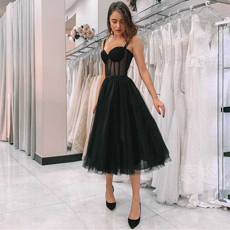 WD0211,Elegant Girls Formal Gown Dot Black Tulle Tea Lenth Short Prom Homecoming Dresses with straps