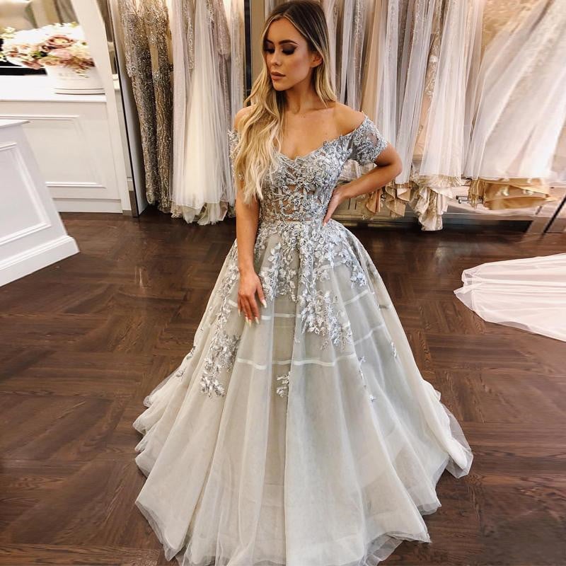 WD0322,Off the shoulder ball gown grey applique prom dresses tulle lace evening party dress