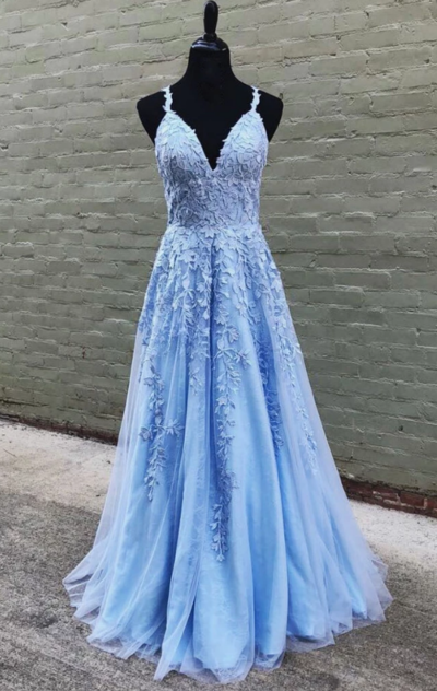 WD0337,A Line Spaghetti Straps Appliques Long Blue Prom Dresses,Sexy Evening Dress