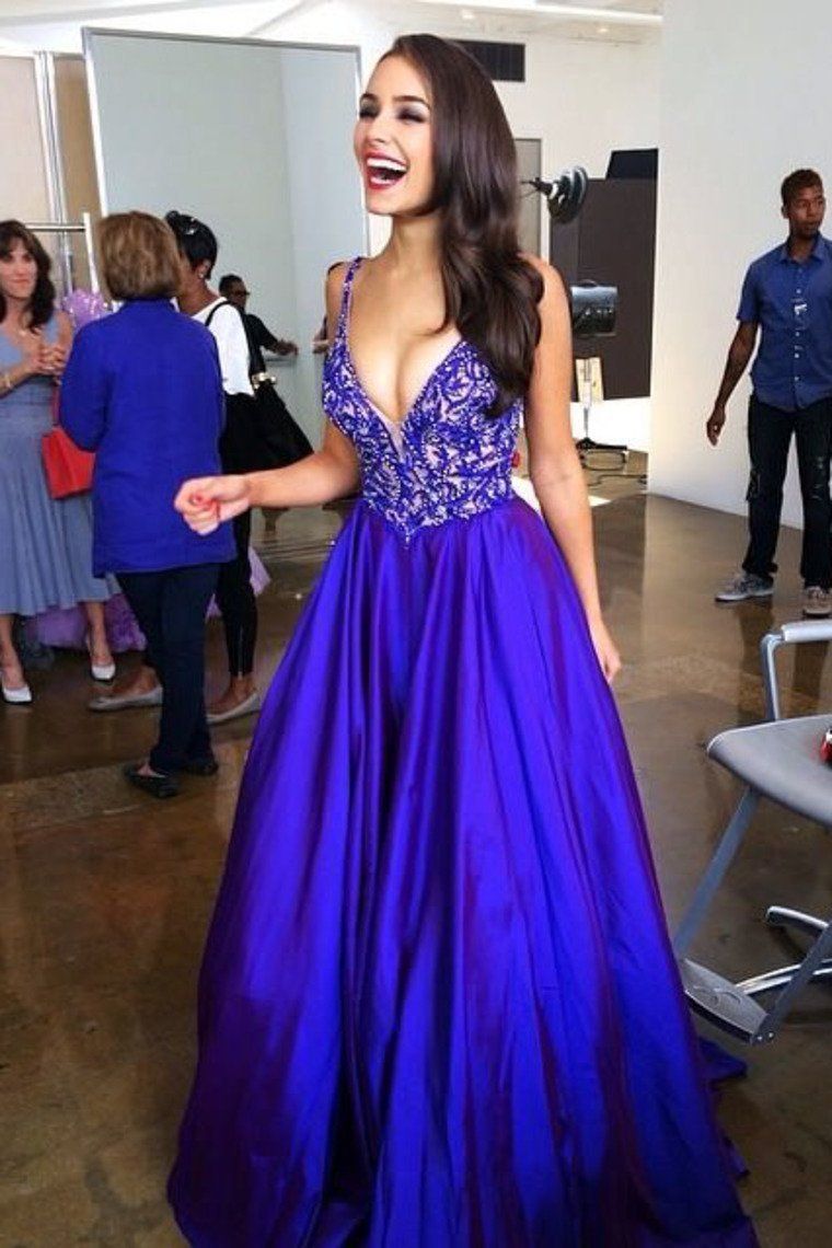 WD0483,Royal blue a line long prom dress,v neck satin ball gown with beaded